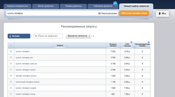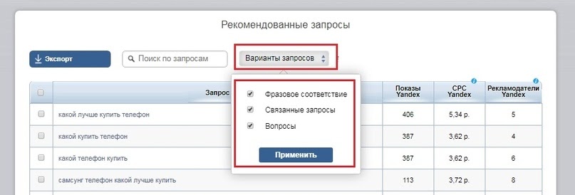 Теперь осталось только выгрузить все запросы нажав на кнопку «Экспорт». Хочу отметить, что этот инструмент является бесплатным и его можно использовать в демо доступе, но в этом случае не будет доступна функция выбора вариантов запросов.