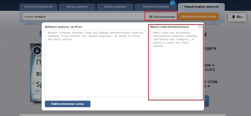 Мы можем добавить минус-слова, чтобы исключить из поиска ненужные фразы. Для этого необходимо нажать на кнопку «Пакетный режим» и в появившемся окне, вписать слова для исключения нерелевантных запросов.