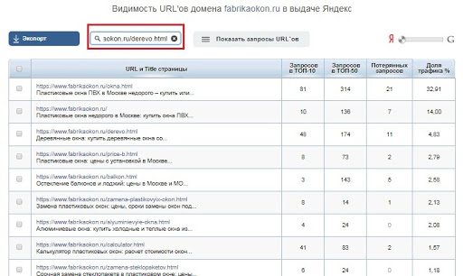 На следующей странице мы видим все страницы сайта, по которым сайт получает трафик в органическом поиске. В строку поиска вводим URL страницы которую мы хотим найти и жмём Enter: